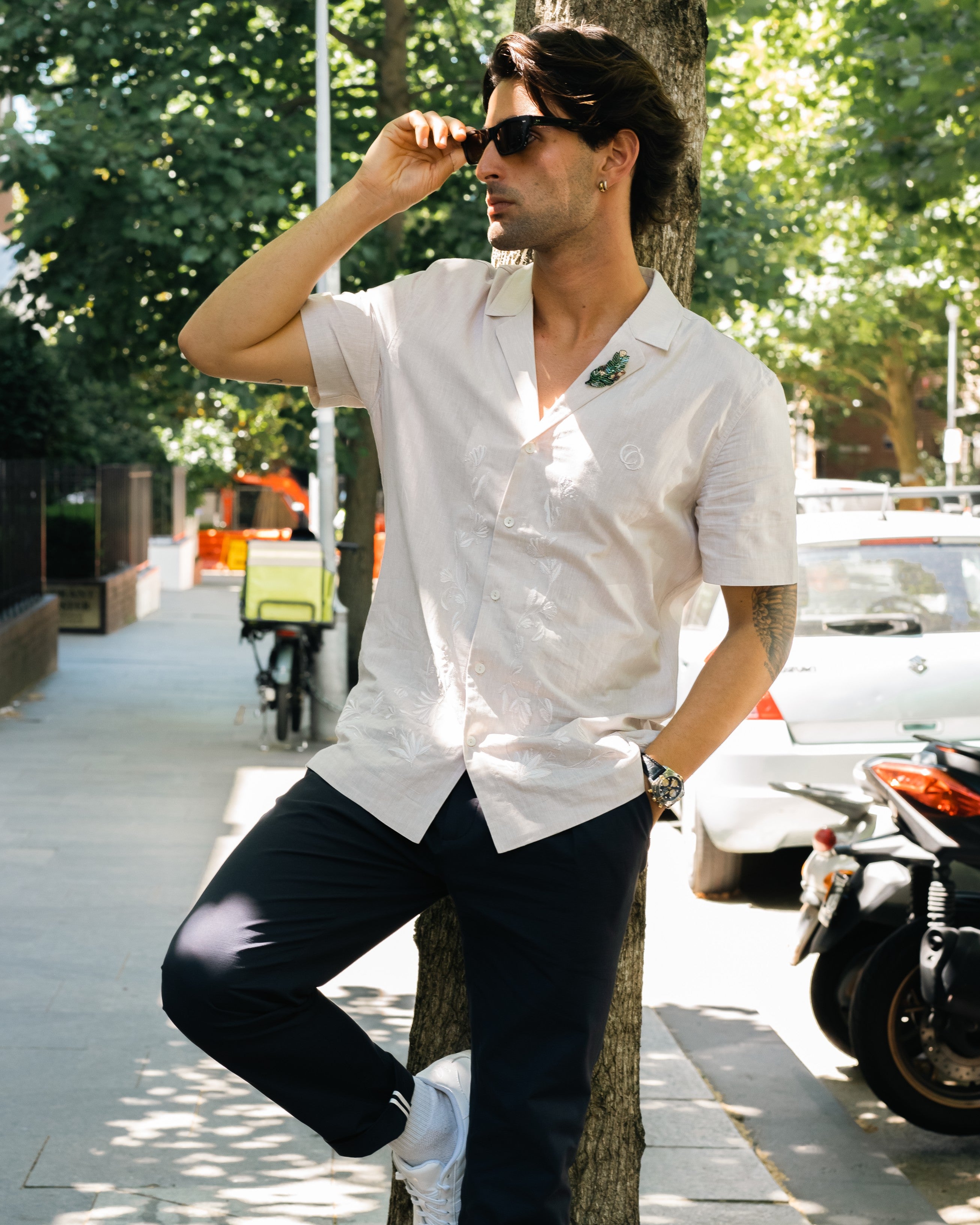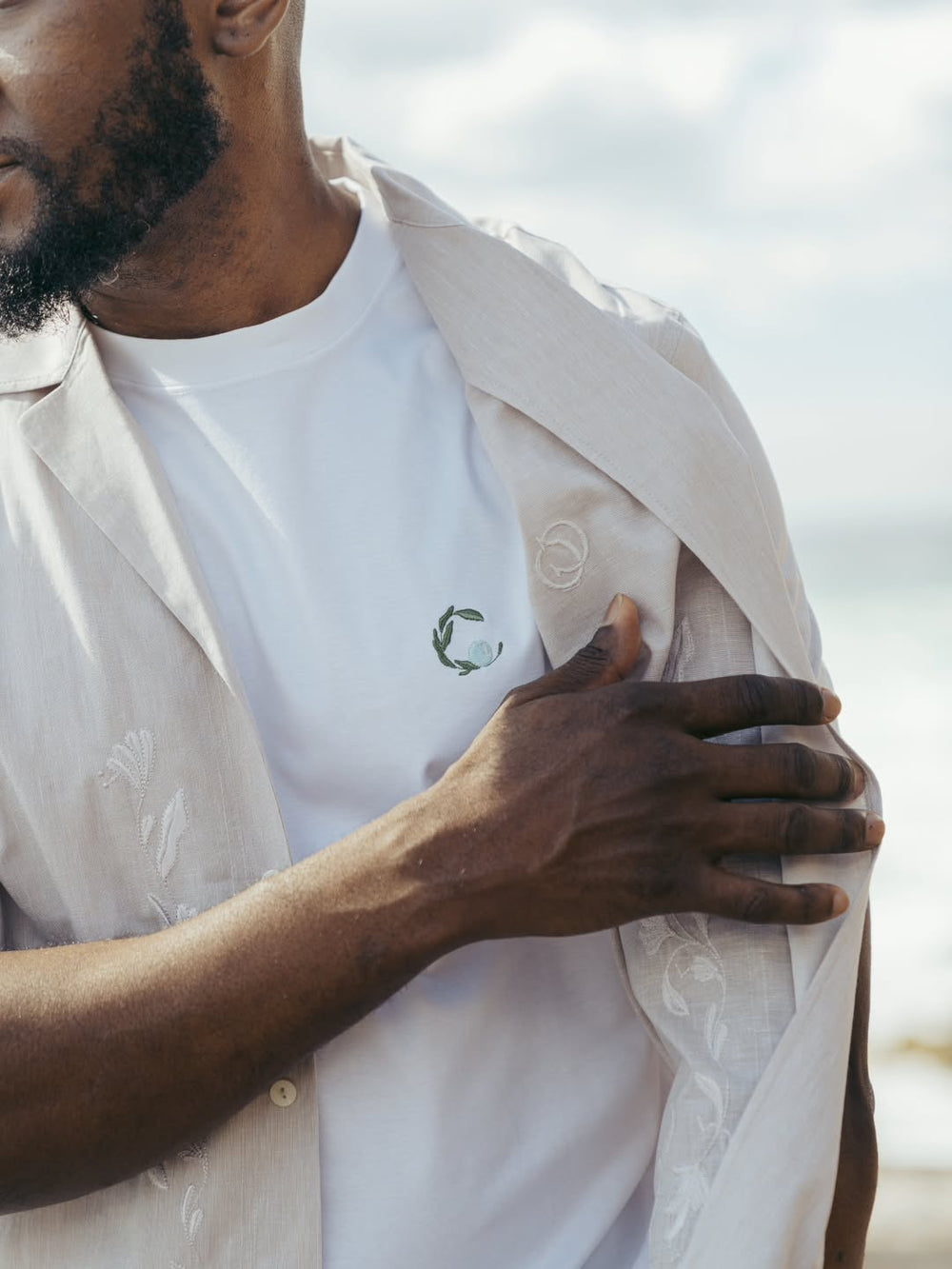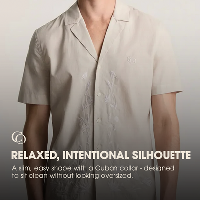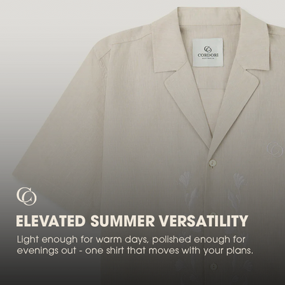 lightweight and easy on the body, finished with subtle tonal embroidery that adds quiet character. Designed for warm days and effortless wear, it balances laid-back ease with refined craftsmanship.