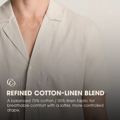 A relaxed Cuban-collar shirt crafted from a breathable cotton–linen blend. Ember is