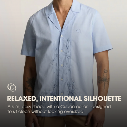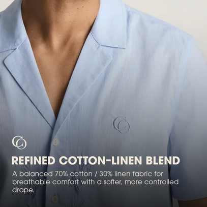 A relaxed Cuban-collar shirt crafted from a breathable cotton–linen blend. Ember is