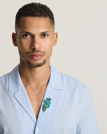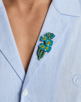 Azure Bloom is Cordori’s hand‑embroidered floral brooch, inspired by the delicate beauty of seasonal blue blossoms. Crafted with artisanal embroidery and coloured detailing on a brass base, it brings a touch of refined craftsmanship to jackets, shirts, or accessories.