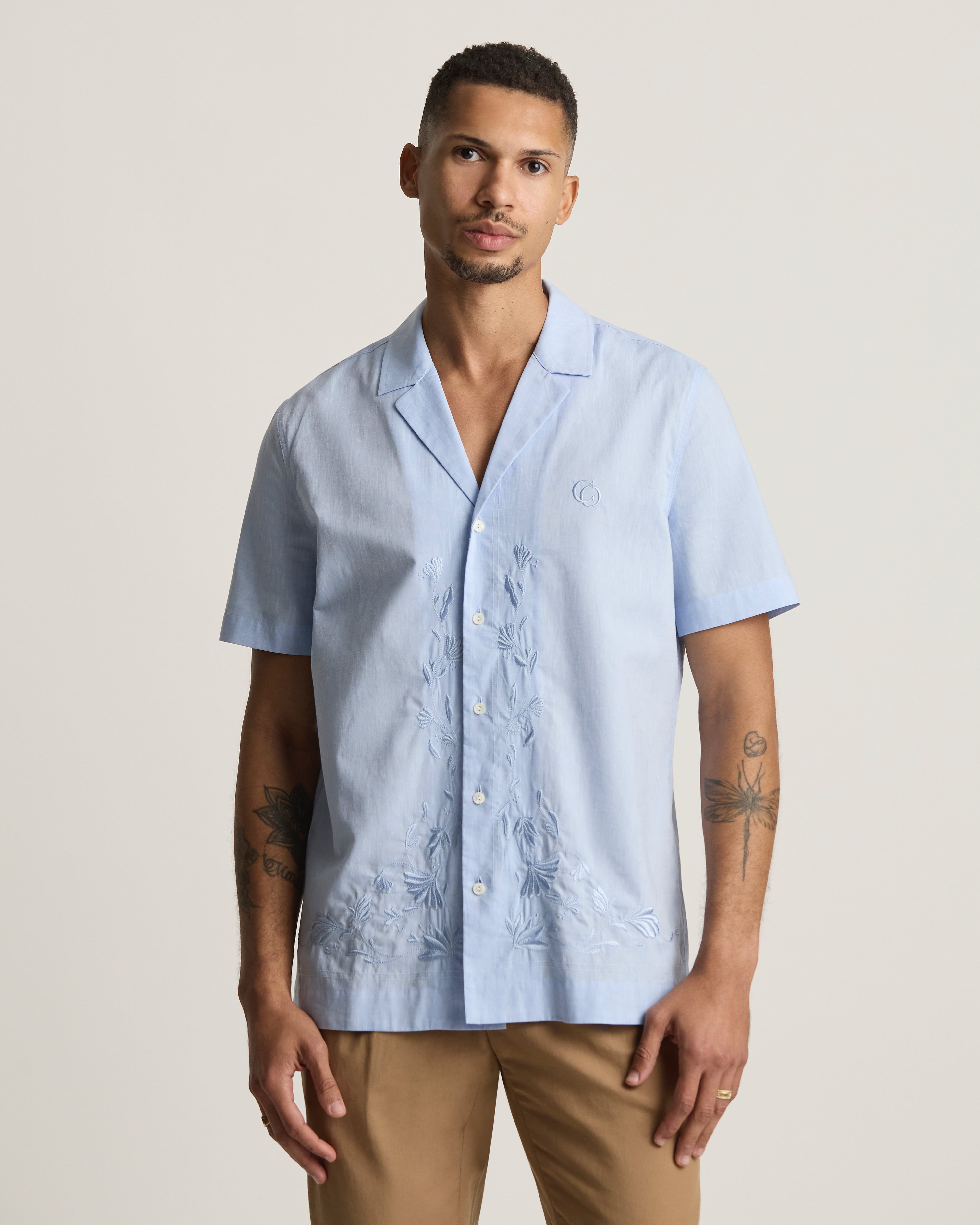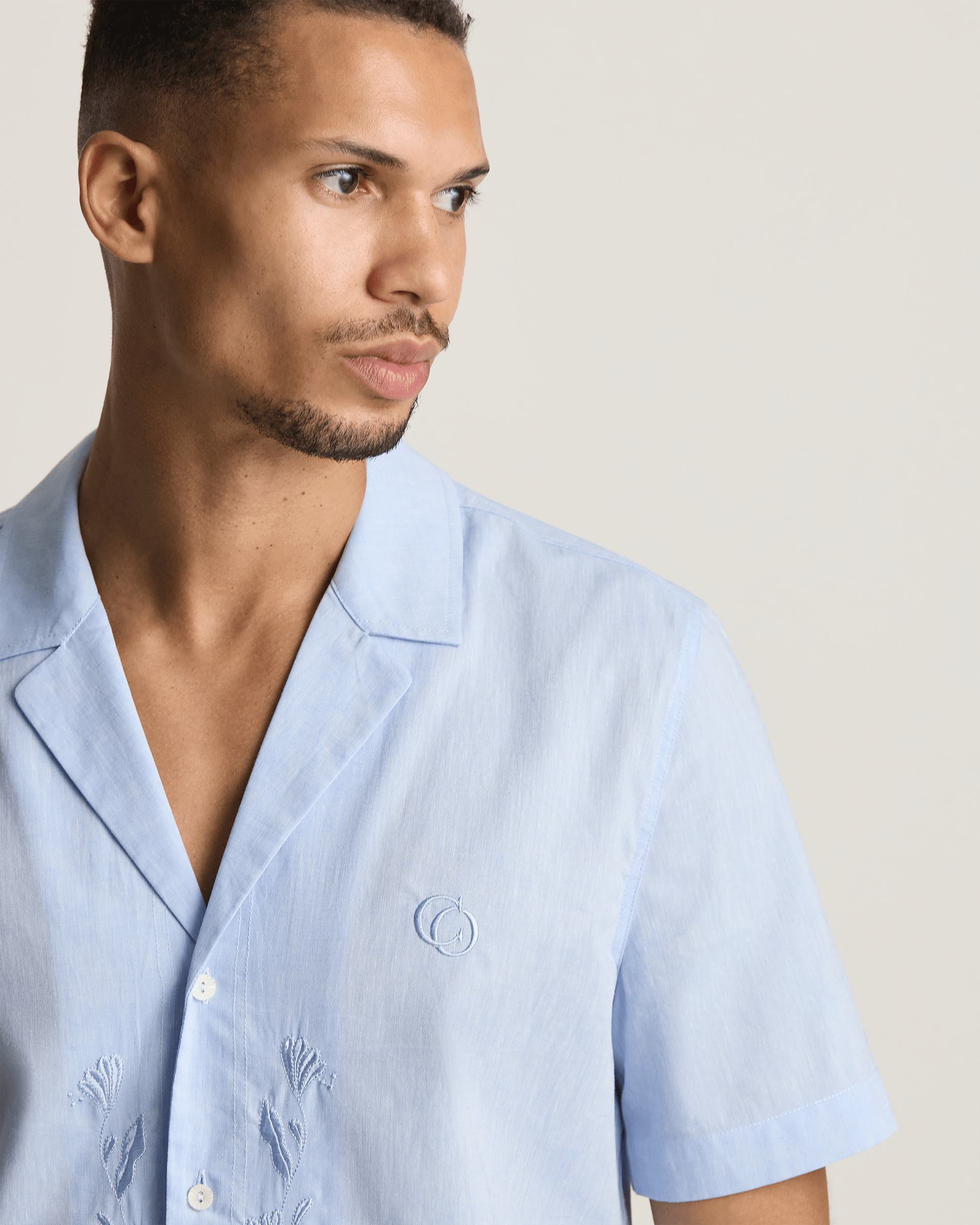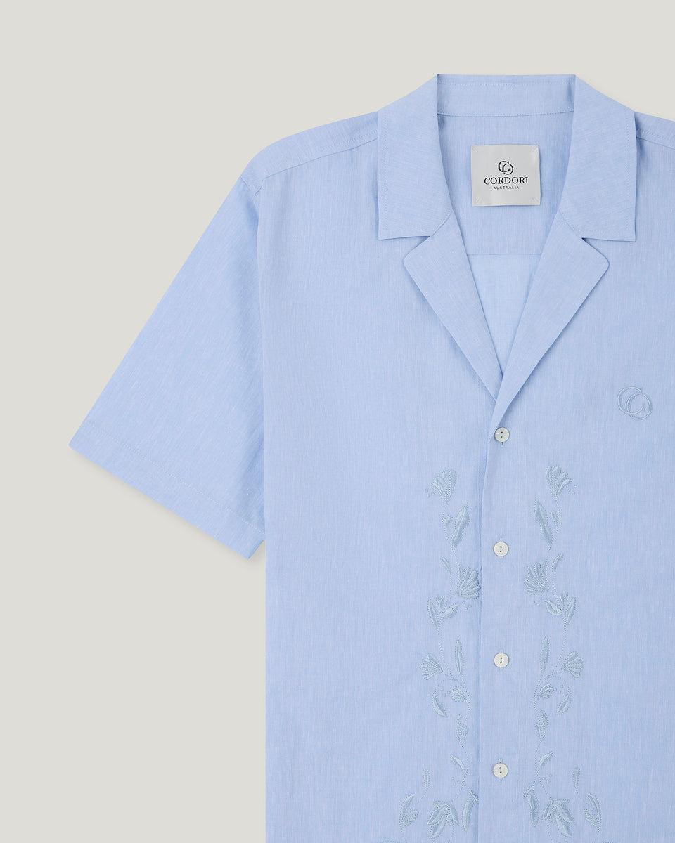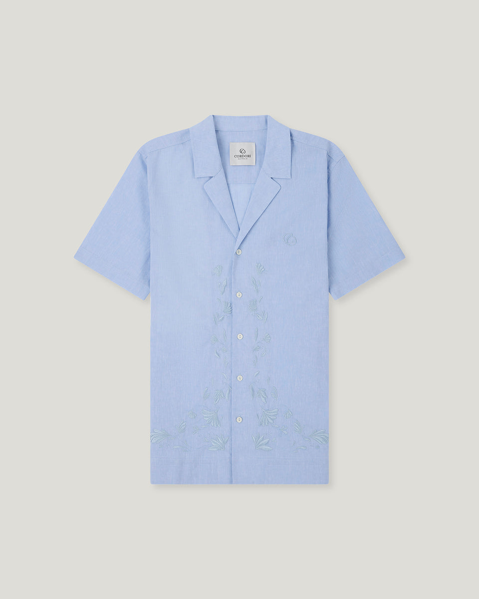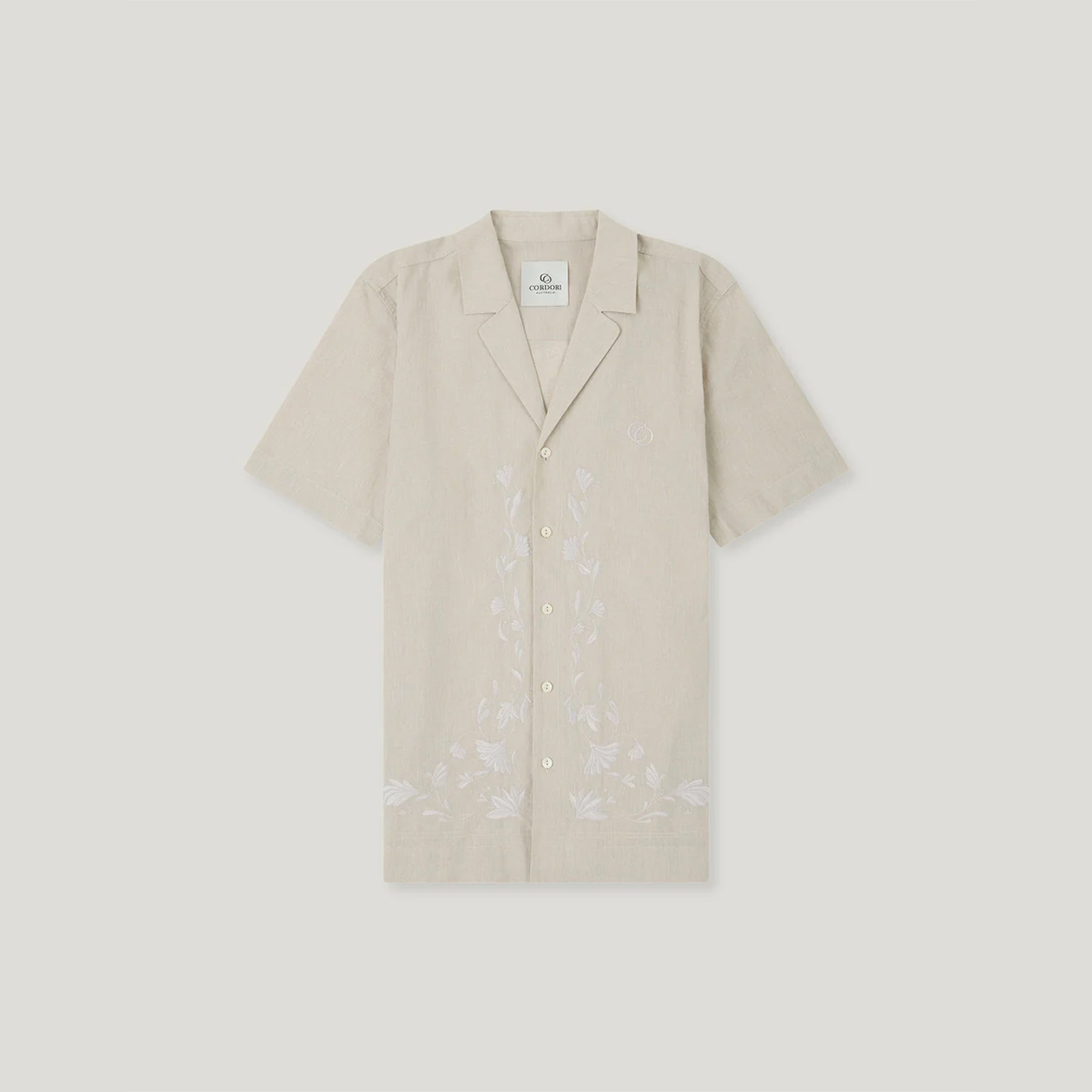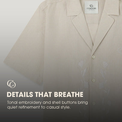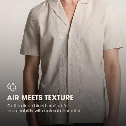 EMBER is Cordori’s signature luxury men’s Cuban‑collar embroidered shirt, crafted from a breathable cotton‑linen blend. With its relaxed cut, shell buttons, and delicately tonal floral embroidery, it embodies laid‑back sophistication.