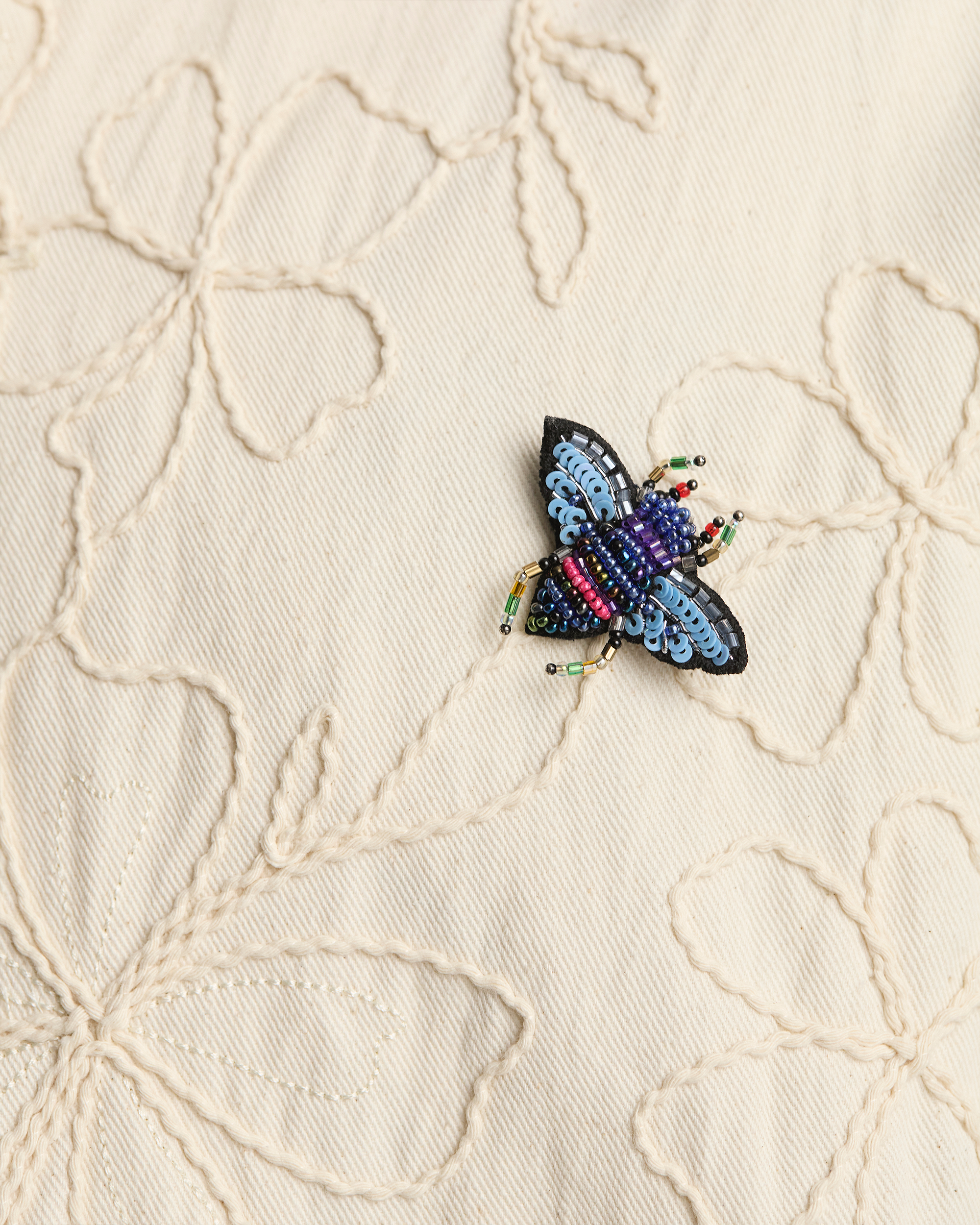 Flight of Flora is Cordori’s hand‑embroidered bee brooch, crafted with fine artisanal detail to complement the Amara shirt jacket. Combining delicate hand embroidery with a polished brass base, it adds a subtle botanical accent to jackets, shirts, or bags, celebrating Cordori’s signature craftsmanship.