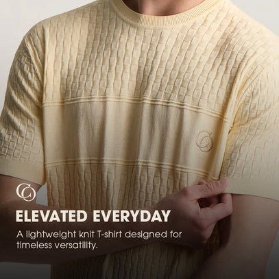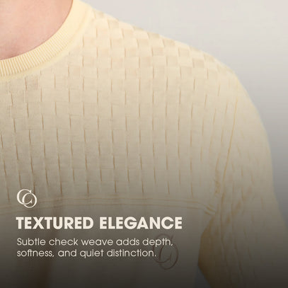 LUMEN is Cordori’s expression of luxury men’s knitted T‑shirt design, crafted from an exquisite blend of extra‑fine merino wool and silk. With its softly textured check weave and natural sheen, this short‑sleeve knit balances comfort and refinement. Lightweight yet elevated, it offers a timeless alternative to everyday T-shirts, perfect for sophisticated casual wear or layered styling.