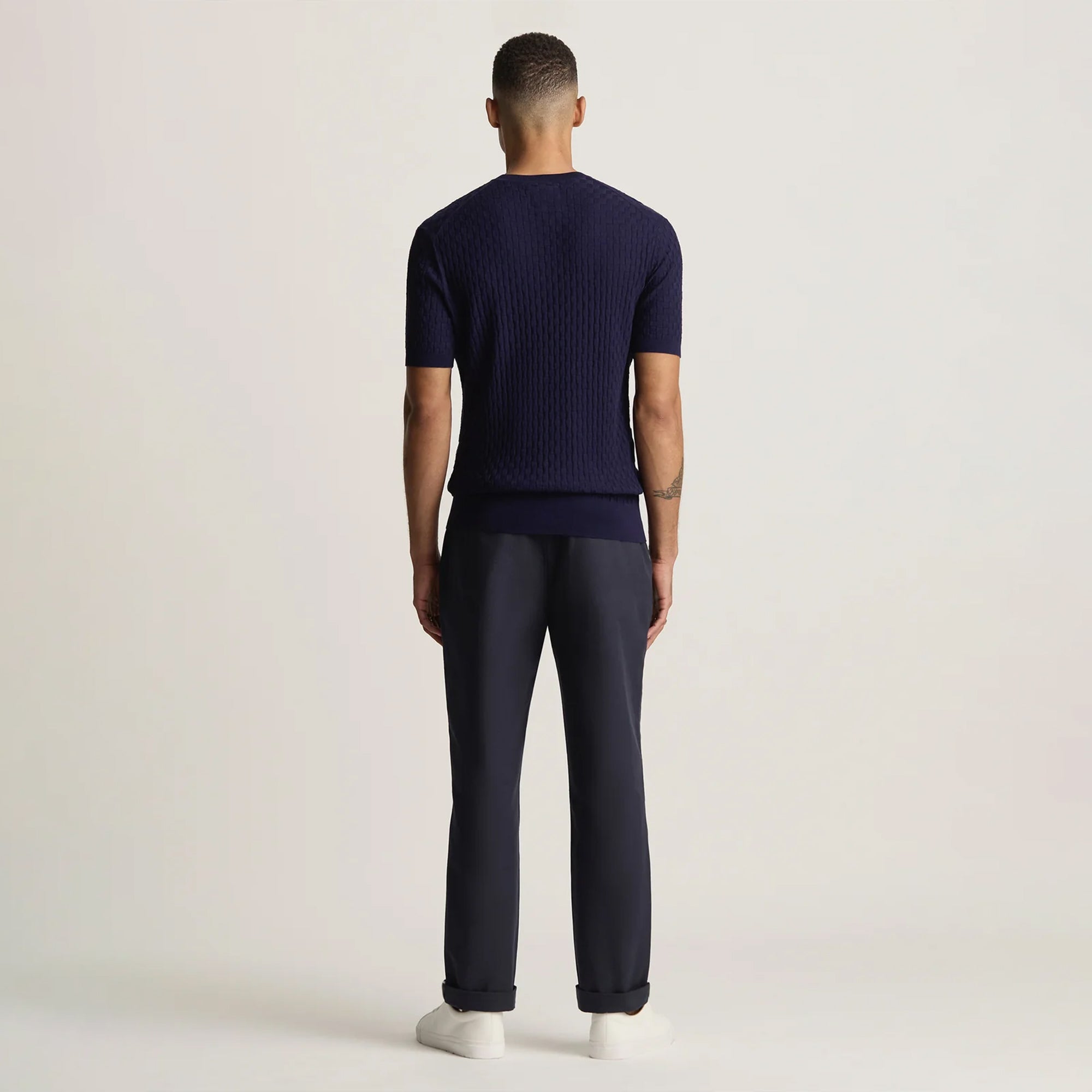 LUMEN is Cordori’s expression of luxury men’s knitted T‑shirt design, crafted from an exquisite blend of extra‑fine merino wool and silk. With its softly textured check weave and natural sheen, this short‑sleeve knit balances comfort and refinement. Lightweight yet elevated, it offers a timeless alternative to everyday T-shirts, perfect for sophisticated casual wear or layered styling.